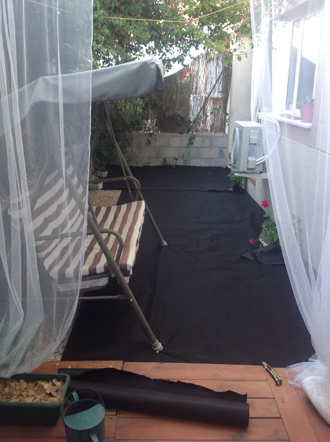 Una vez liso el terreno y arrancadas todas las hierbas que habían, coloqué la malla anti hierbas que como su propio nombre indica es para que no salgan hierbas :)